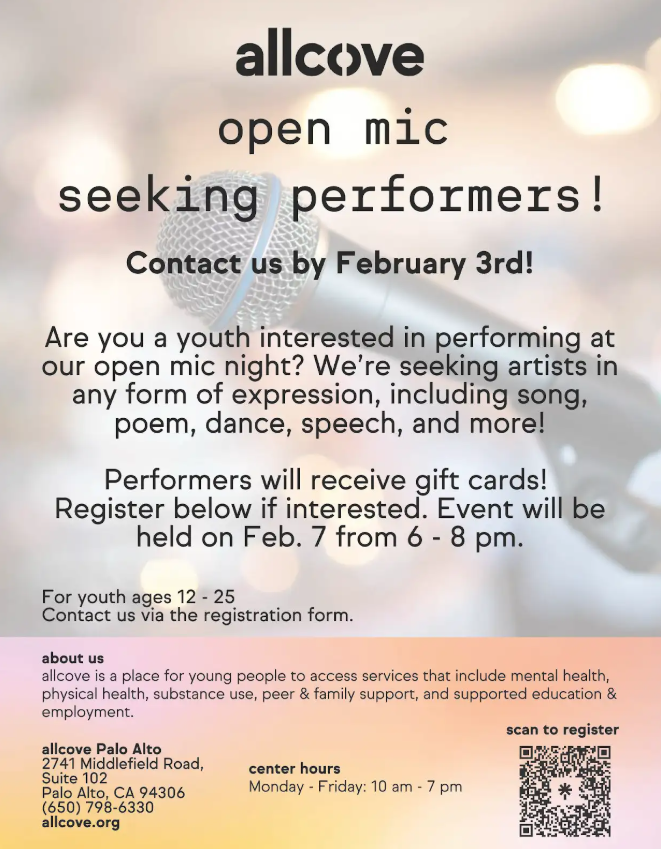 We’re seeking artists in any form of expression, including song, poem, dance, speech, and more! Performers will receive gift cards! Register below if interested. Event will be held on Feb. 7 from 6 - 8 pm.