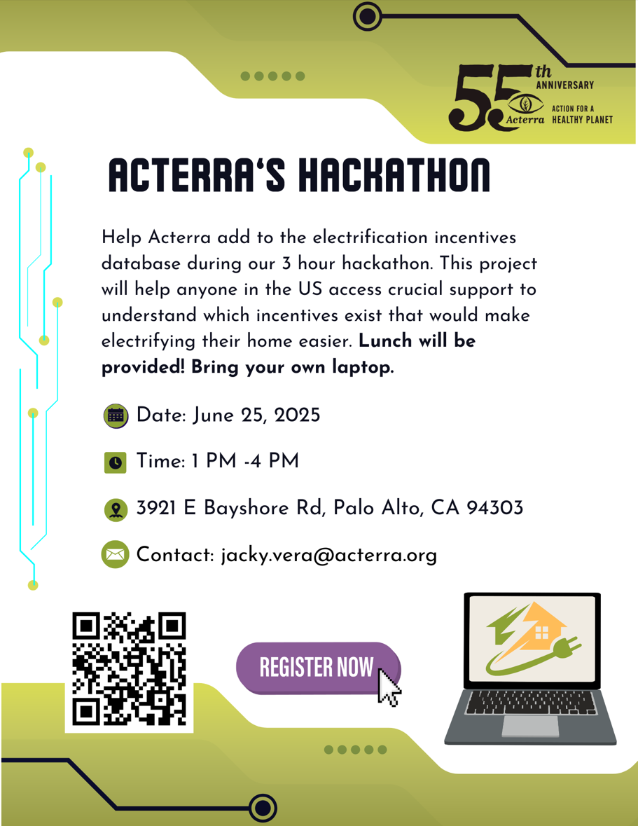 Help Acterra add to the electrification incentives database during our 3 hour hackathon. This project will help anyone in the US access crucial support to understand which incentives exist that would make electrifying their home easier. Lunch will be provided! Bring your own laptop.
