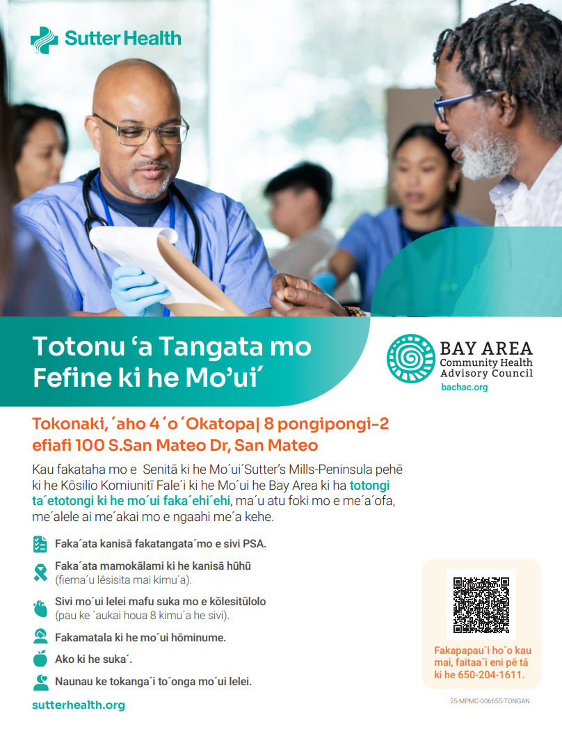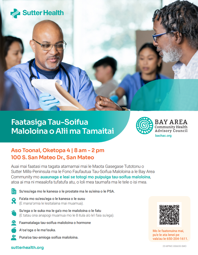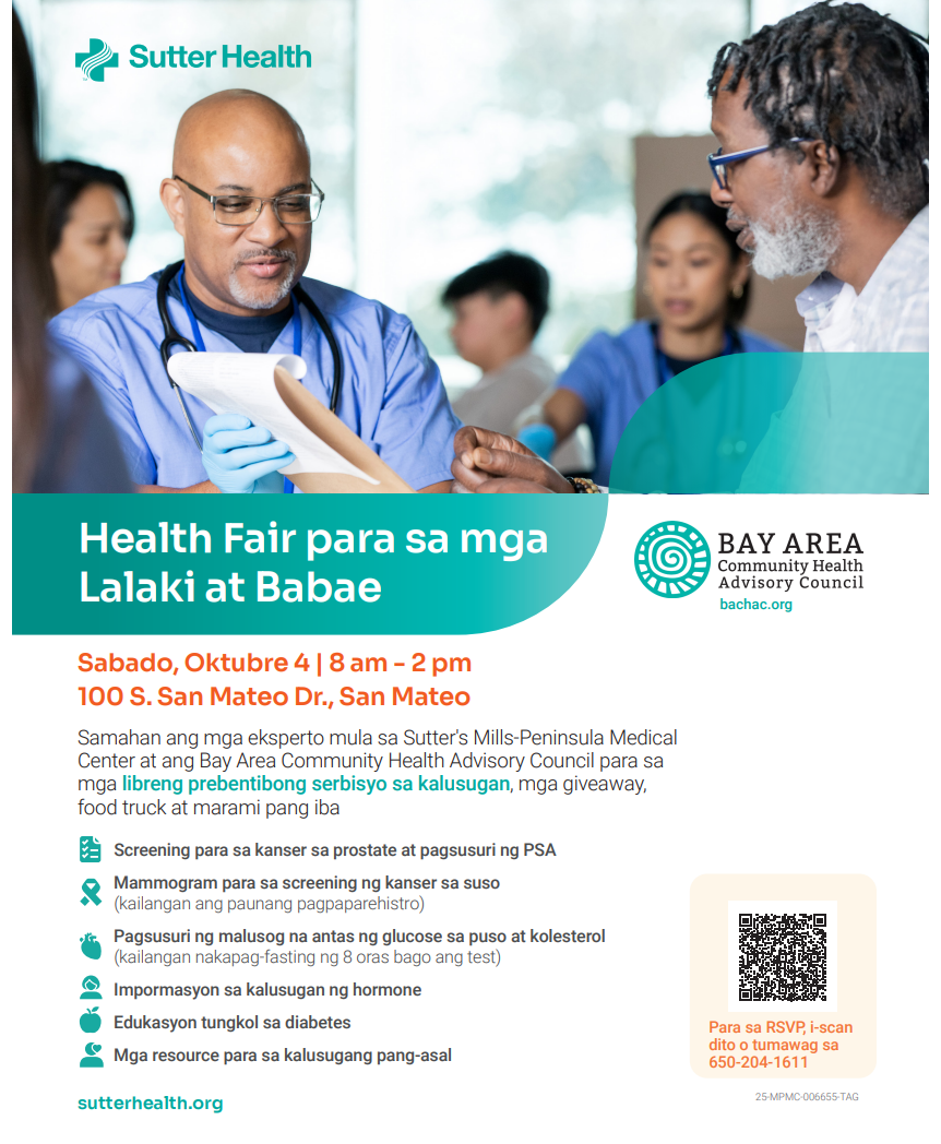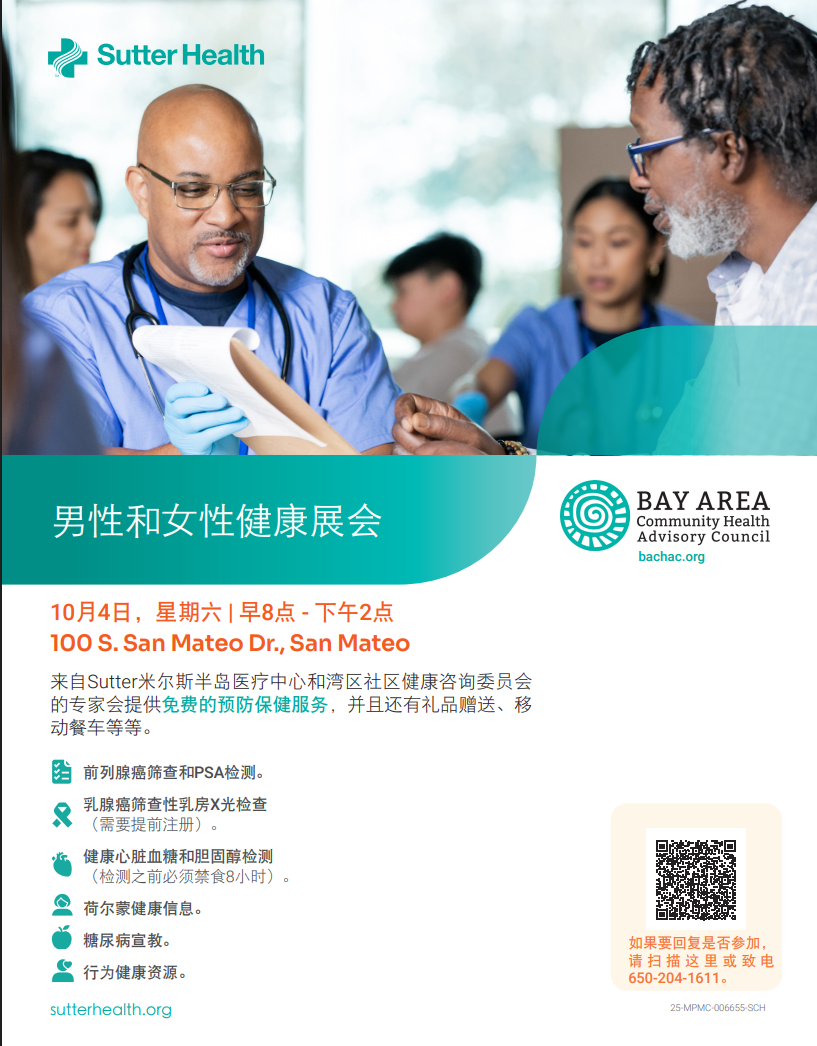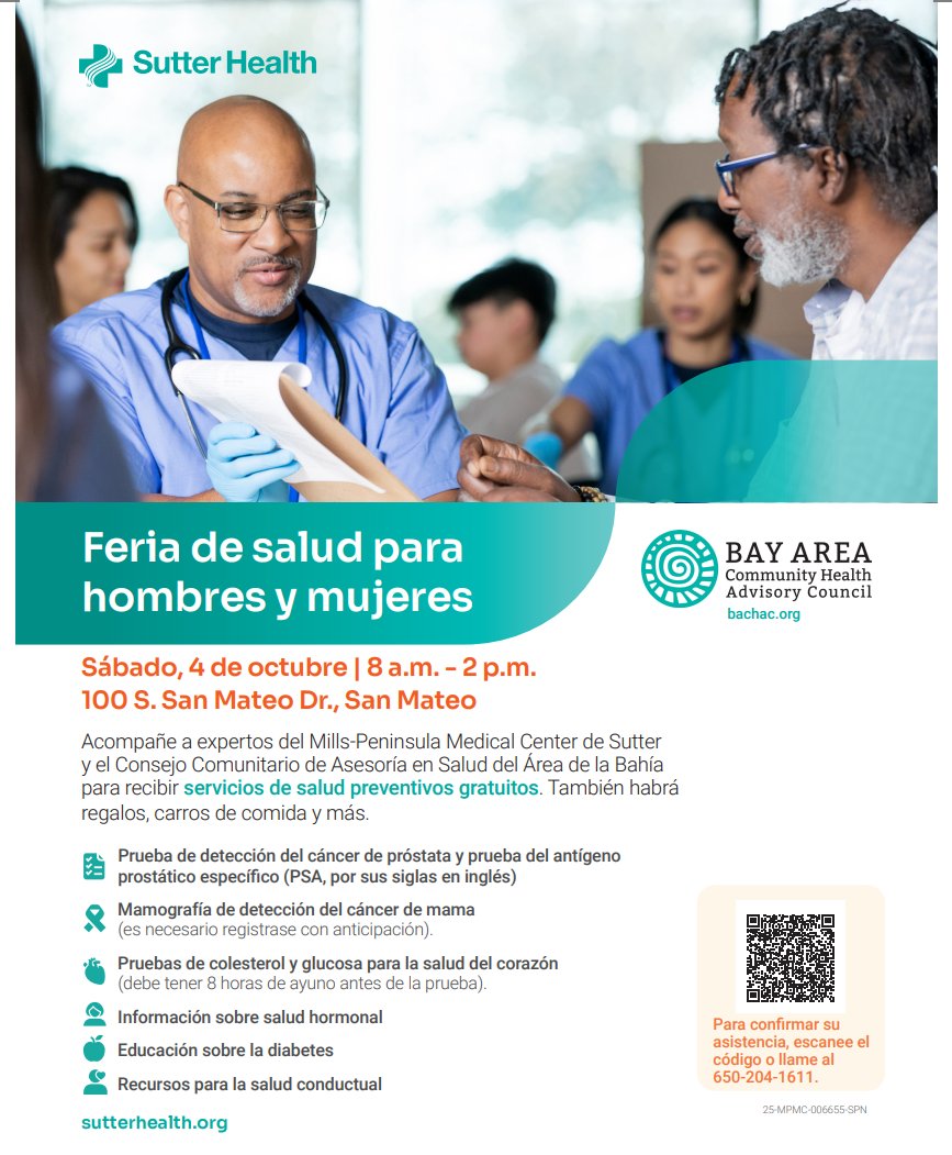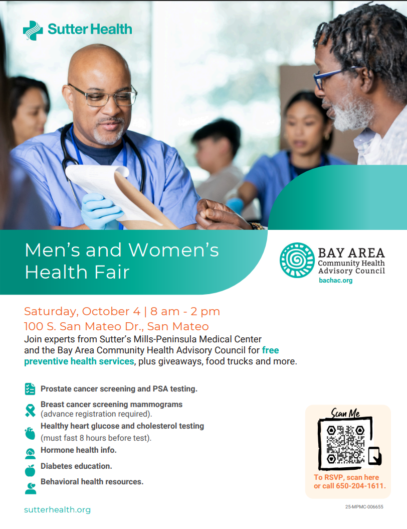 BACHAC, in partnership with Sutter Health's Mills Peninsula Medical Center, is hosting the Men's and Women's Health Fair on Saturday, October 4th from 8am-2pm.