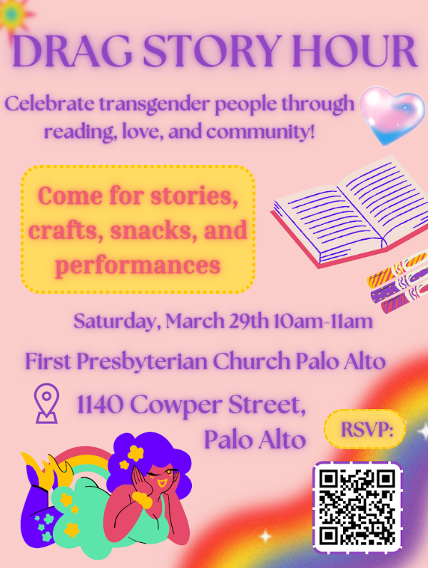 Celebrate transgender people through reading, love, and community. Come for stories, crafts, snacks, and performances. The event will be held on Saturday, March 29th, from 10 to 11 a.m. at First Presbyterian Church Palo Alto (1140 Cowper Street, Palo Alto, CA 94301).